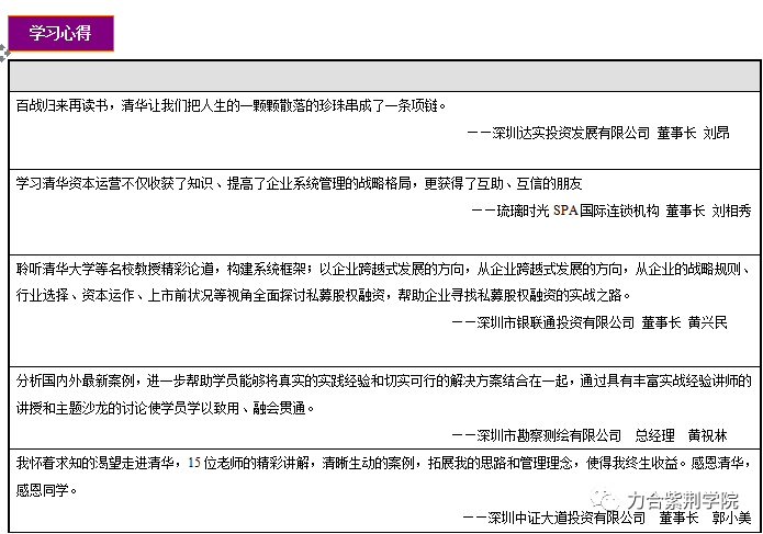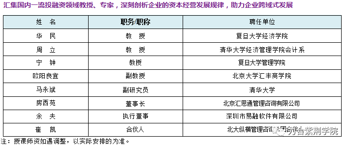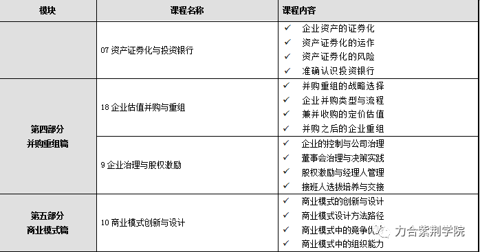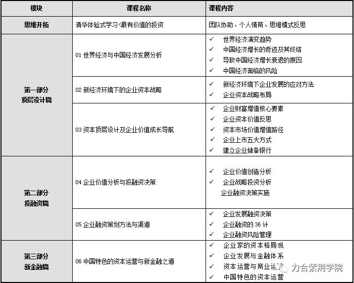 ² 根据企业发展规律与资本市场发展趋势,资本顶层设计篇、投融资篇、并购重组篇、新金融篇、商业模式篇,五大模块涵盖了企业家资本经营核心课题,全面提升学员对资本战略的理解深度,最有效地实现企业的资本升级和产业优化!