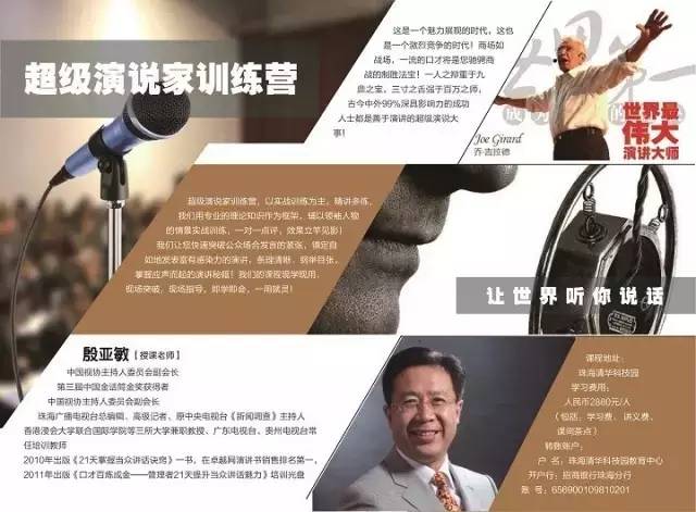 这是一个魅力展现的时代,这也是一个激烈竞争的时代!商场如战场,一流的口才将是您驰骋商战的制胜法宝!一人之辩重于九鼎之宝,三寸之舌强于百万之师,古今中外99%深具影响力的成功人士都是善于演讲的超级演说大师!