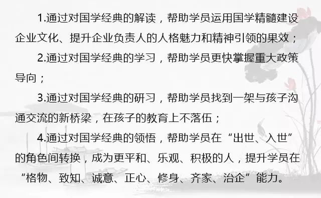 儒家修身、兵家建功、佛道增慧、易学广智,我深深地感受到企业管理者在提升管理实务能力的同时,需要拥有一门浑厚的学问,就是国学。