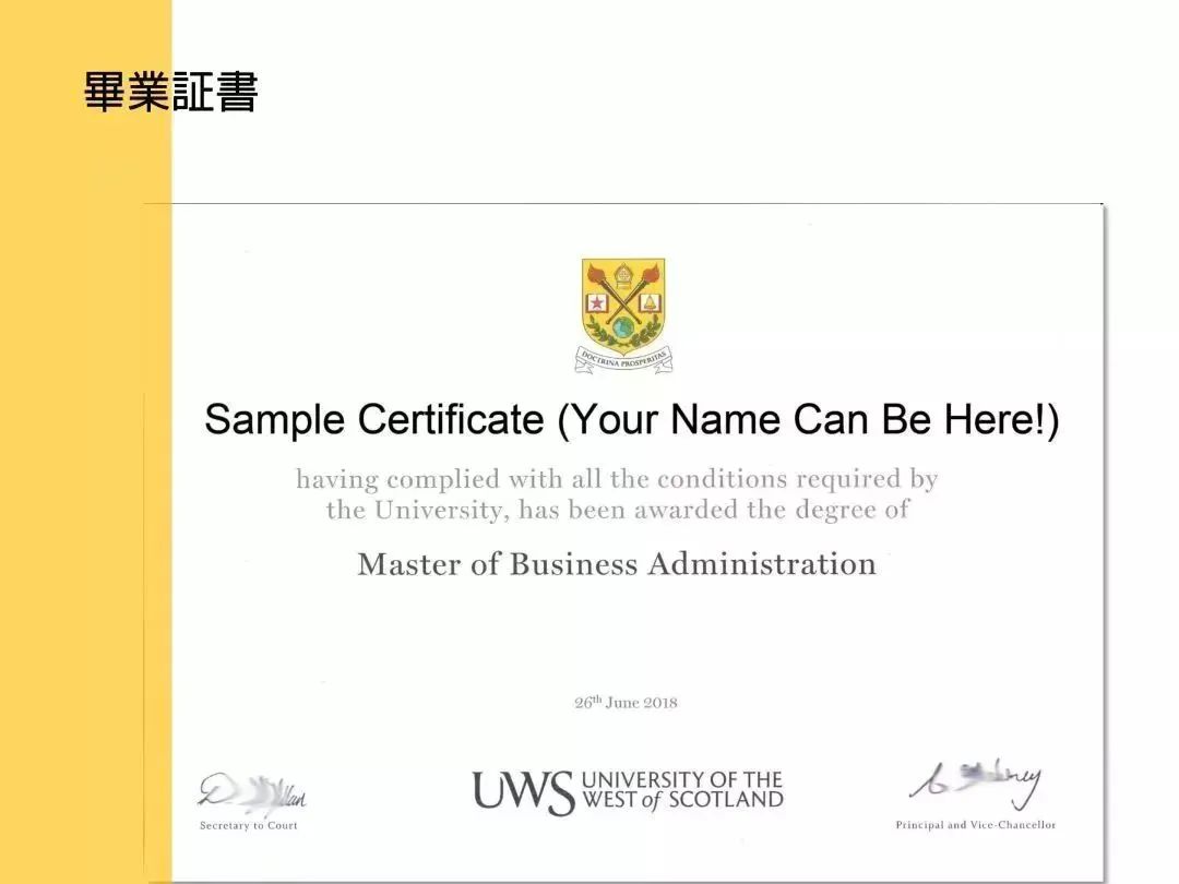 完成第一阶段核心课程学习后进入第二阶段学习(海外或境外2.5天)最后进行第三阶段论文,考核成绩合格者可申请授予英国西苏格兰大学工商管理MBA硕士学位,