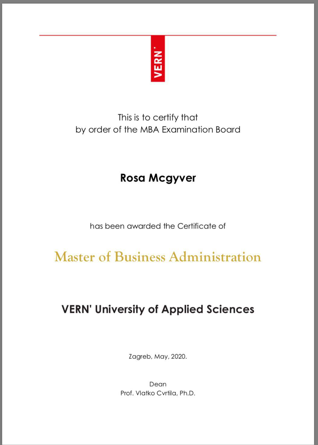 克罗地亚VERN 应用科学大学颁发国际承认的“工商管理MBA硕士学位证书”