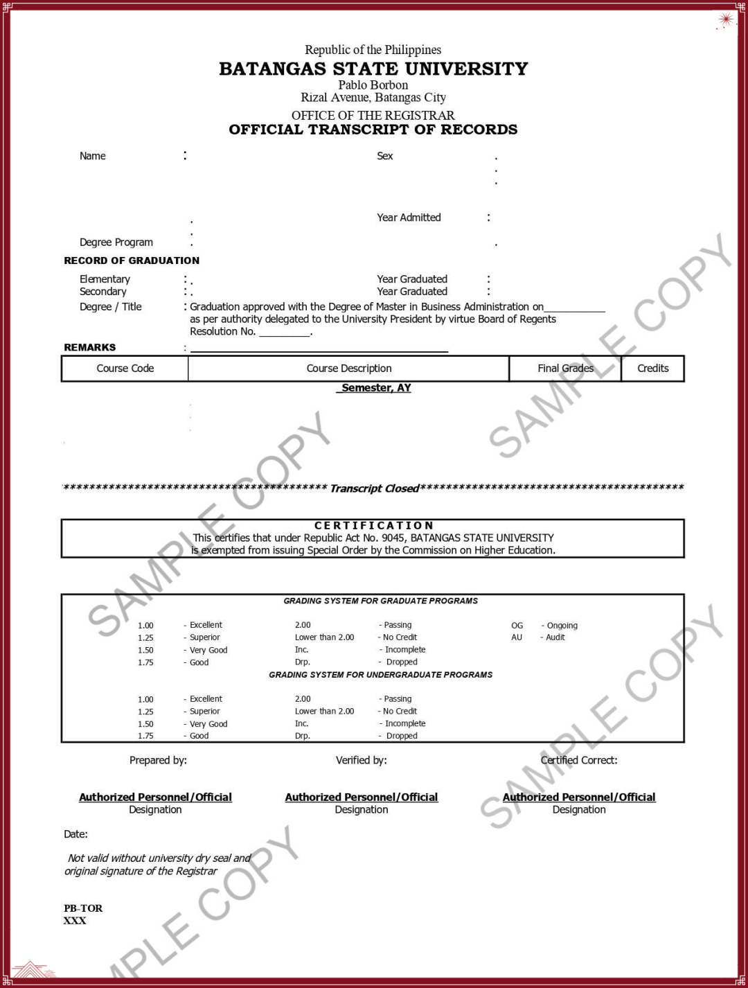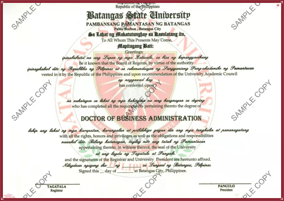 完成所有学科要求,并通过论文答辩,由菲律宾八打雁国立大学(Batangas State University)按照规定颁发相应学位证书。毕业典礼在菲律宾八打雁国立大学(Batangas State University)举行,由校长亲自授予学位。