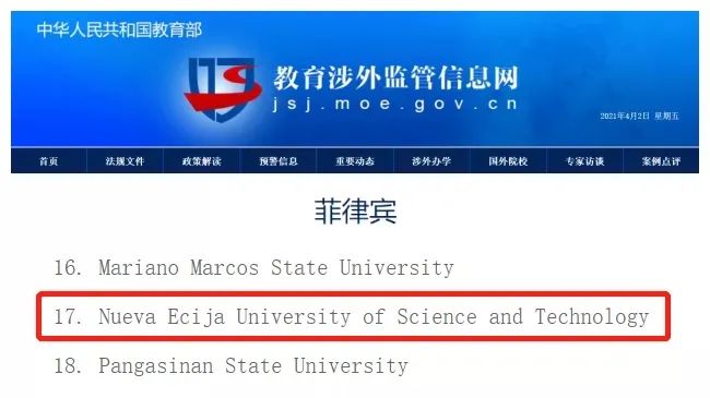 不过现在这些都不是问题!因为目前菲律宾新埃西哈科技大学(Nueav Ecija University of Science and Technology )的1.5年制硕士既不用国考也不用出国,现在仅剩几个名额,还不快抓住这个难得的机会!