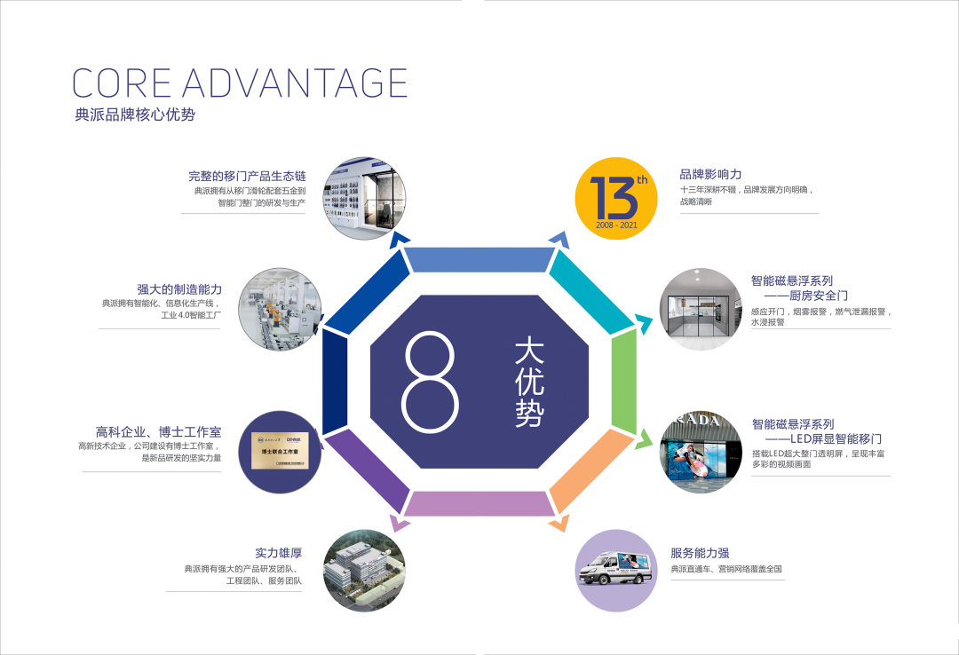 典派智能(移门)科技在致力于公用、商用、家居、艺术展示四大空间的移动门智能创新和智能制造方面,具备强大的品牌基因。凭借企业自身的研发创新实力、产品生态配套能力、院校联合技术能力,以及客户信赖的支撑力,在安全智能化应用与便捷化服务方面,具有独特优势。公司的智能制造可实现全链条流水化作业,国际领先的生产设备、测试系统、信息系统,具备可实现年产十五万套的能力。公司在磁悬浮系统、智控软件具有较强优势,智能安全防护、智能门应用系统覆盖全移门应用场景。LED屏显门系统开创了移门新品类——LED屏显门系统,能够实现更多门用功能及增值价值。公司拥有全类别产品的知识产权。