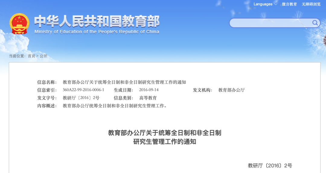 早在2016年,教育部办公厅就印发《关于统筹全日制和非全日制研究生管理工作的通知》明确,自2017年起,全日制和非全日制研究生由国家统一下达招生计划,考试招生执行相同的政策和标准,培养质量坚持同一要求,学历学位证书具有同等法律地位和相同效力。