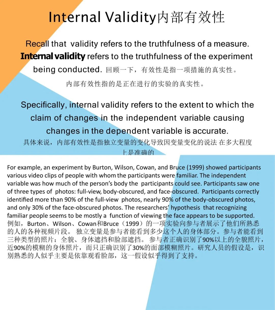具体来说,内部有效性是指独立变量的变化导致因变量变化的说法在多大程度上是准确的。内部有效性是通过进行具有某些特征和没有偏见的实验来建立的。
