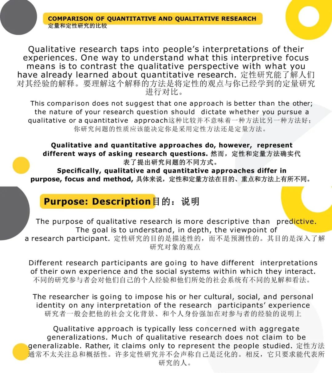 定性研究的目的是描述性的,而不是预测性的。其目的是深入了解研究对象的观点。不同的研究参与者会对他们自己的个人经验和他们所处的社会系统有不同的见解和看法。研究者一般会把他的社会文化背景、和个人身份强加在对参与者的经验的说明上。