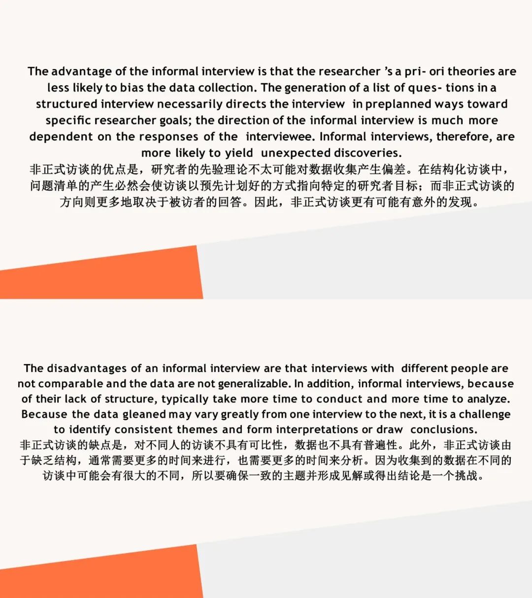 由于结构化访谈中的问题在每次访谈中都是相同的,所以每次访谈的数据都是相同的。因此,在一些受访者中出现的主题和模式更有可能被推广到其他人身上。与非正式访谈相比,这些数据也更容易被综合和分析。此外,结构化访谈通常比非正式访谈更节省时间,因为访谈者和受访者都被准备好的问题牵着走。