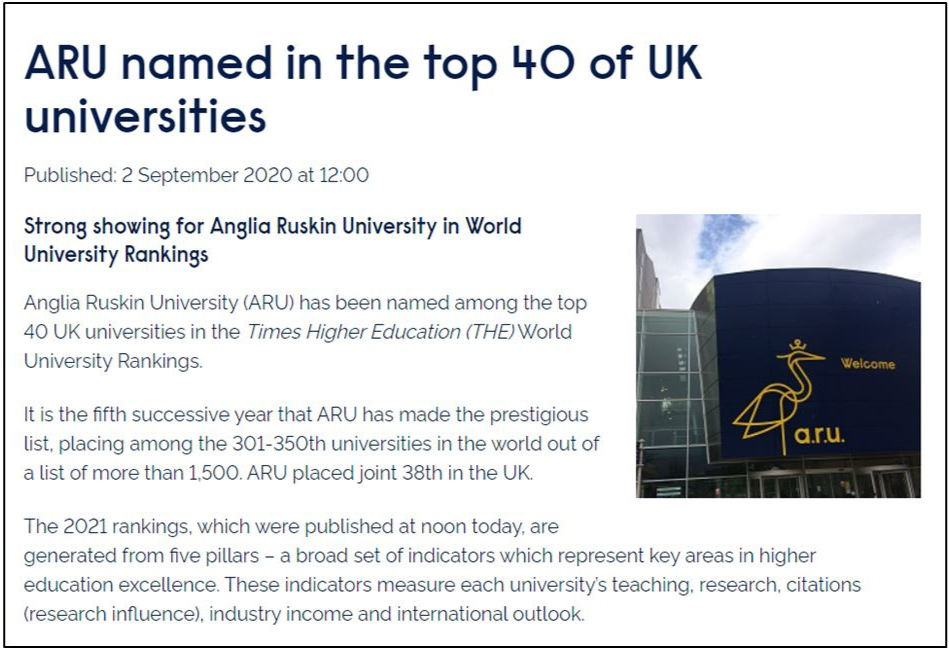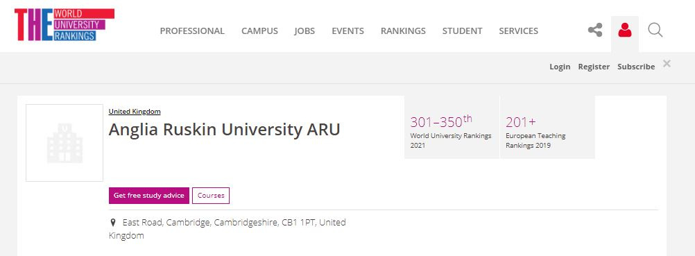 在2016年和2017年泰晤士高等教育世界大学排名榜中,安格利亚鲁斯金大学位居世界大学前350位,在英国大学中名列前40名。排名榜衡量全球大学在办学核心领域的水平,包括教学,科研,知识转化和国际视野。作为唯一一所入选的英国大学,安格利亚鲁斯金大学还因为在国际化领域的出色表现,在2016年荣获全球最佳20位'上升之星'特色大学。